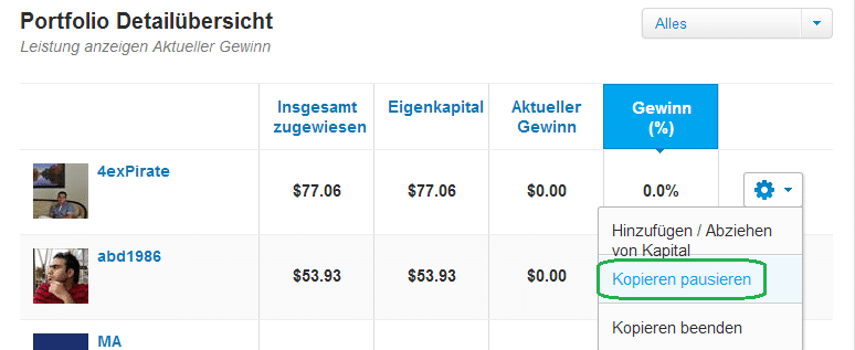 Für viele Nutzer sicher eine sinnvolle Option. Sobald man erkennt, dass der kopierte Trader zunehmend Positionen in den Verlust laufen läßt, diese jedoch nicht schließt, hat man nunmehr die Möglichkeit zu sagen: