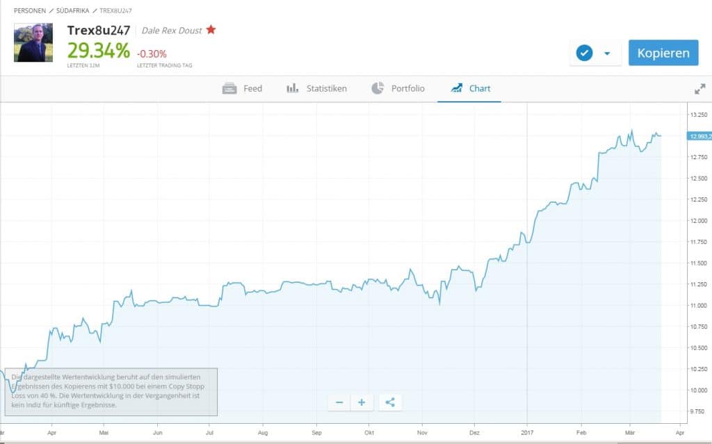Mit Dale Rex Doust aus Südafrika gibt es einen interessanten Anwärter. Seit Ende 2013 auf eToro, jedes Jahr profitabel, verdankt er den Erfolg vor allem seiner guten Auswahl von Technologiewerten. Amazon, Google, Nvidia, Facebook, Netflix, AMD bescherten ihm in der Hausse ansehnliche Gewinne. Eine Wette auf den Trader wäre aber auch eine Wette auf den Fortbestand der Techrally. Der Blick auf den Performancechart des Profils bestätigt die Abhängigkeit. Hier heißt es für mich also erst einmal abwarten.