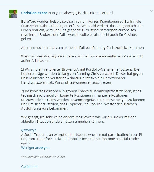 In der Diskussion nahm der deutsche Support auch Stellung zu dem Vorgehen von eToro.