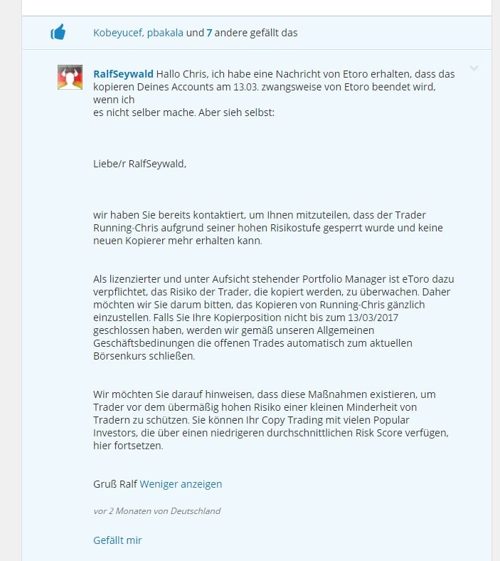 Schaut man sich jetzt die Reaktionen auf eToro an, dann ist der Frust zwar nachvollziehbar aber das Handeln der Plattform korrekt. Die Schließung wurde den betroffenen Kopierern angekündigt, siehe nachstehender Screen.