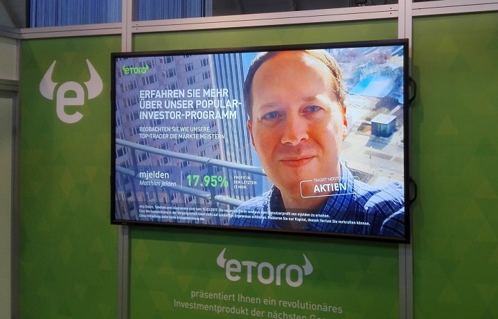 Auf der Invest 2017 in Stuttgart war auch der Marktführer im CFD basierten Copytrading mit einem repräsentativen Stand vertreten. Im Mittelpunkt standen dabei die neuen Investmentprodukte, die CopyPortfolios von eToro und die Partner CopyPortfolios und u.a. einige Popular Investors der Social Investment Plattform. eToro hatte dazu eine ansprechende Slideshow auf ihren Standscreen vorbereitet und so zogen einige Namen am Auge des Betrachters vorbei. Neben einigen internationalen Gesichtern sah man Hanse-Invest und auch JBinvest. Herr Busenius war am Samstag auch am Stand präsent und stand für Fragen zur Verfügung. Auch Grigori Klassen aka woron2008 war unter den Besuchern. Aus persönlicher Erfahrung heraus ist jedoch immer etwas kritische Distanz zu den aktuellen Aushängeschildern angebracht.