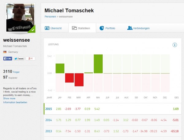 Deine Performance auf eToro für 2015 schaut von dem Bild her zu urteilen sehr solide aus. Auch 2014 war nicht so schlecht, hast im Gegensatz zu anderen Profilen auf eToro keine größeren Drawdowns. Allein zwei Monate in 2013 waren schlecht, ansonsten hast du ein sehr interessantes Profil finde ich. Wie schätzt du denn eToro allgemein ein? Ist es schwieriger oder einfacher dort Follower zu generieren als auf den anderen Plattformen? Wie ist die Dichte von guten Tradern?