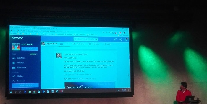 Mike Knauff führte sehr unterhaltsam durchs Programm und die etwa 120 Besucher konnten sich mit Informationen zu den Themen Kryptos, Aktien und eToro versorgen. Die Vorträge von Dennis Austinat von eToro, Oliver Michel von block66.de und aktienlust.tv waren angenehm informativ und hinterließen nicht den Eindruck, dass man eigentlich auf einer Verkaufsveranstaltung war.