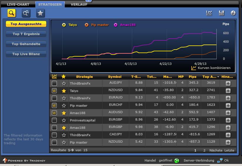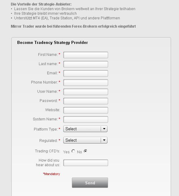 Tradency gibt Tradern die Möglichkeit, sich mit ihren Strategien bei Tradency zu bewerben. Ausgewählte Strategien stehen dann über Mirror Tradern angeschlossenen Brokerpartnern zur Verfügung.