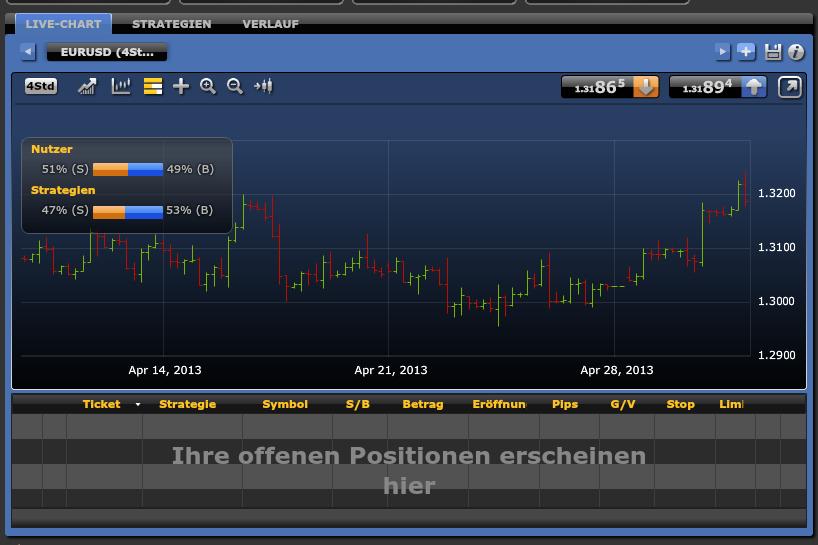 Neben den verschiedenen Chartfunktionen stellt Mirror Trader auch das aktuelle Sentiment in einem Handelsinstrument grafisch dar. Sowohl in Bezug auf die angeschlossenen Konten, als auch in Bezug auf die ausgeführten Handelsstrategien.
