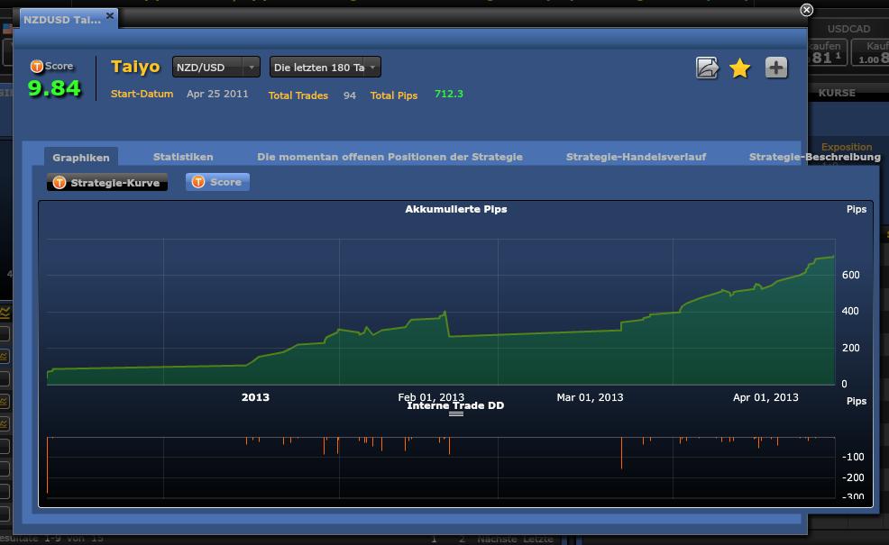 Bei Klick auf die verlinkten Tradeny Signal Provider öffnet sich ein Fenster mit den wesentlichen statistischen Informationen zur angebotenen Strategie. Eine Beschreibung der Handelsstrategie ist ebenfalls hinterlegt.