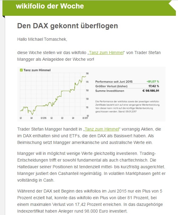Das neue Jahr ist keine 2 Wochen alt und schon gibt es Grund zur Freude für mich. Ein treuer Leser des Blogs konnte seine Qualitäten als Finanzexperte auf wikifolio.com unter Beweis stellen und wurde aktuell in der Kampagne von wikifolio.com mit dem wikifolio der Woche ausgezeichnet. Sein wikifolio „Tanz in den Himmel“ macht dem Namen alle Ehre. Inzwischen sind weitere Euronen in das wikifolio gerollt und Stefan konnte nun auch die 100.000 Euro AuM knacken.