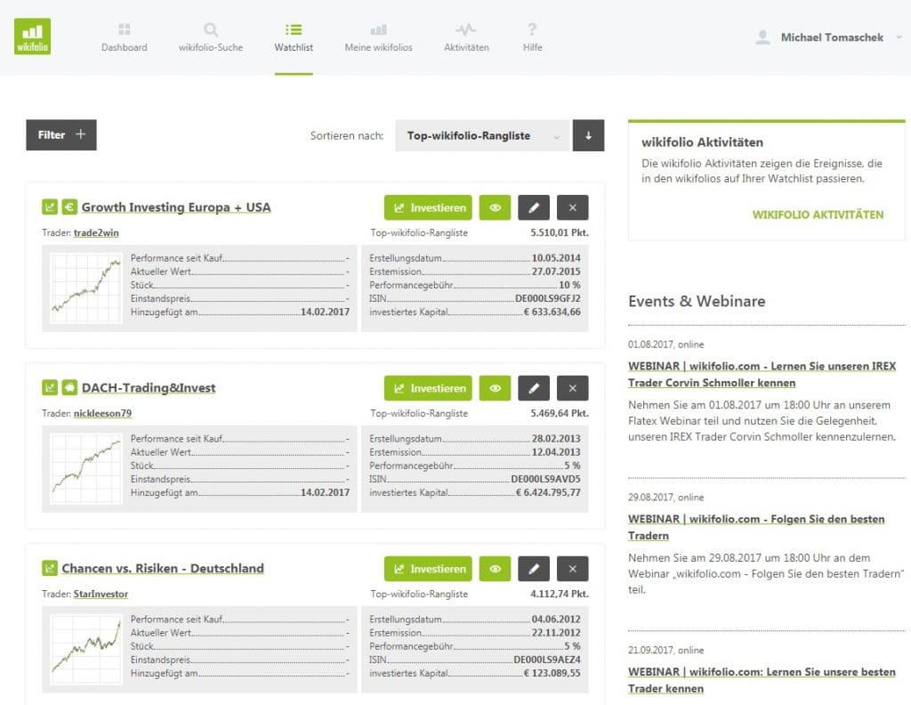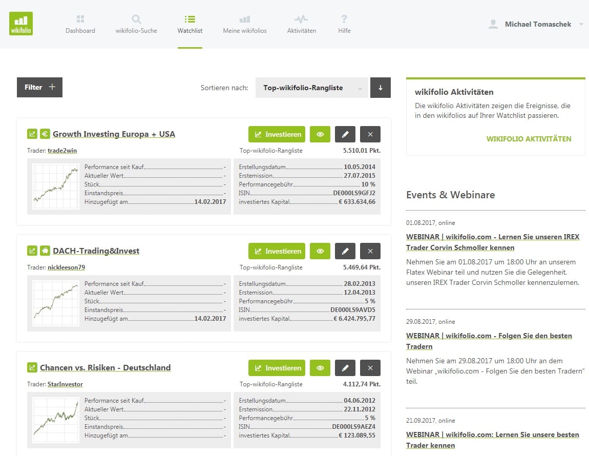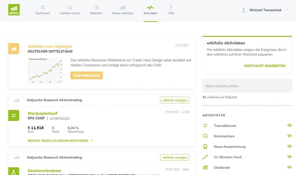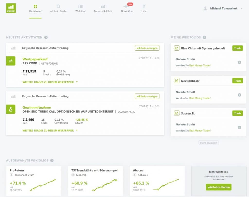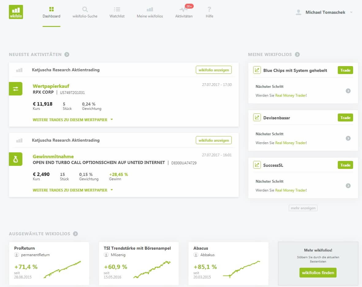 …begrüßt den Nutzer mit den neusten Aktivitäten der wikifolios auf der Watchlist, einer Übersicht der eigenen Produkte und ausgewählten Anlagestrategien.