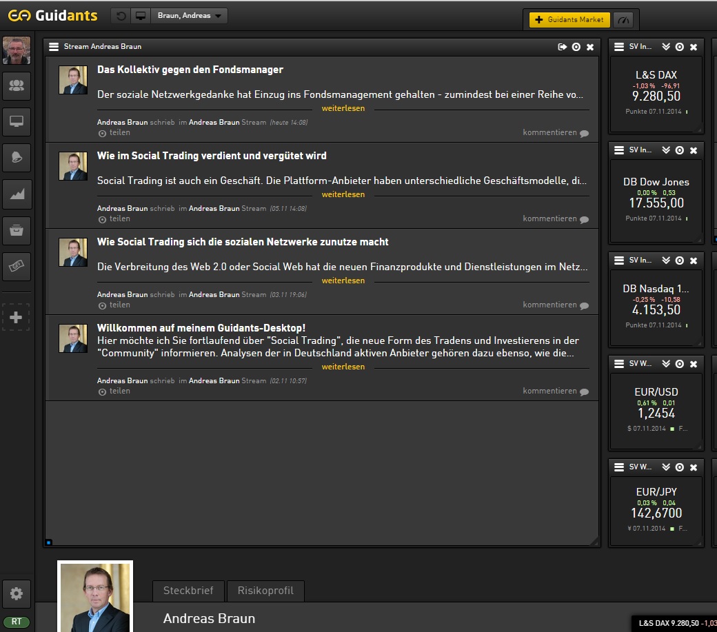 Social Trading hat nun auch eine Heimat auf der Plattform von Guidants gefunden. Das multifunktionale Portal aus dem Hause Godmode Trader bietet neben diversen News-, Chart- und Analysetools auch einen Stream unterschiedlichster Analysten und Trader an. Je nach Vorlieben kann der User seinen Experten folgen, sei es nun Highspeed Trader Heiko Behrendt, Wellenreiter Andre Tiedje, BrokerDeal Experte Michael Hinterleitner oder Portfoliomanager Stefan Riße. Godmode Trader erweitert stets die Kooperationen und bietet Raum für Vielfalt.