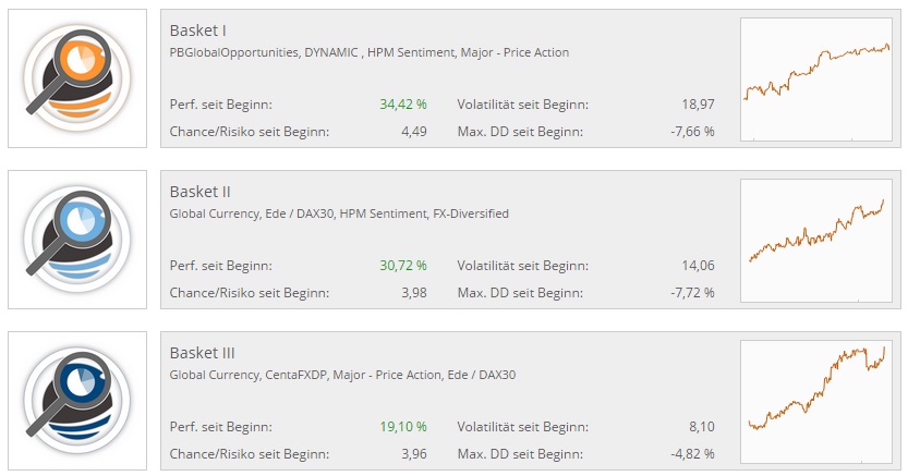 In den Baskets I bis III finden sich aktuell jeweils 4 aufeinander abgestimmte Strategien. Die von United Signals getroffene Auswahl berücksichtigt auch ein angemessenes Chance/Risiko Verhältnis. Vergleicht man die Performancezahlen mit dem maximalen Drawdown seit Beginn, so finden wir hier wieder ein gesundes Verhältnis.