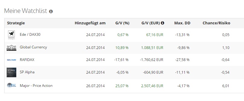 Werfen wir dazu einmal einen Blick in meine seit Juli 2014 geführte Watchlist bei United Signals. Meine damaligen Favoriten schlugen sich sehr unterschiedlich.