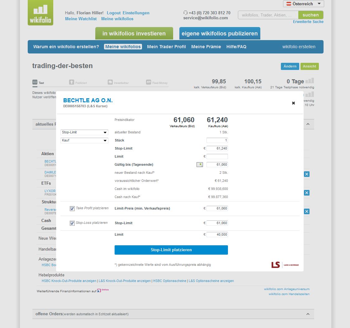 Alle wesentlichen Orderfunktionen, Limit, Stop, Stop Buy, StopSell, OCO sind integriert und dürften der Masse der Trader auf wikifolio vollauf genügen. Je nach Handelsinstrument wird es auch Teilausführungen geben, eben wie im richtigen Leben… Mindestabstände, wie man sie aus dem CFD-Handel kennt, gibt es nicht. Aktuell laufen Stabilitätstests, denn schließlich soll den Anwendern eine fehlerfreies und zuverlässiges Tool zur Verfügung gestellt werden.
