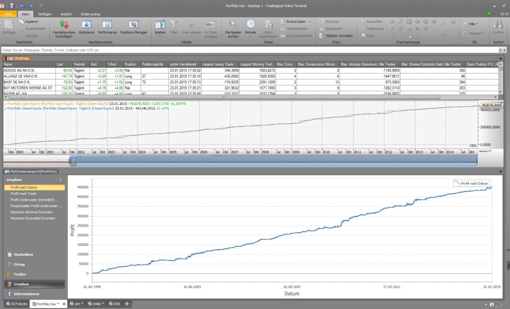 Schlüsselpunkt der Strategie sind die Positionsgrößen und das eingegangene Risiko pro Trade. Dies ist klar definiert. Anfangsposition 5.000 Euro bei max. 500 Euro Risiko. Dank des Ringelreigens im Dax ist häufige Rotation angesagt. Mal sind die Versorger stark, mal die Automobile etc. Sehr interessant ist an der oben gezeigten Grafik, das seit 1999, also vor den Crashzeiten, das System stabil arbeitet. Mal mehr und mal weniger profitabel – long only !