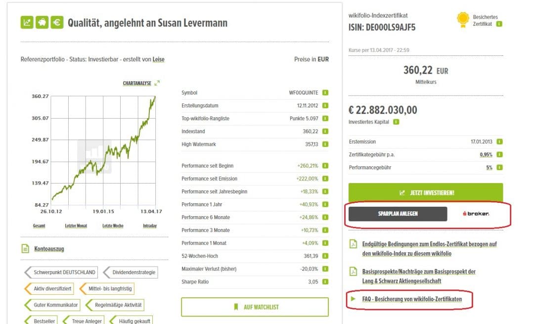 Wie ihr wisst, sind auch einige Zertifikate auf wikifolios sparplanfähig. Damit dies funktioniert und “massentauglich” verkaufbar wird, muss dem Thema Sicherheit der Anlage natürlich besondere Beachtung geschenkt werden. Hier sehe ich nun weiteres Potential für Wachstum bei wikifolio, da diese Hürde durch die Besicherungslösung genommen ist. Sparpläne gibt es derzeit aber nur über S Broker. Da die Ordergebühren gesponsort werden, ist eine regelmäßige Investition in das verfügbare wikifolio Universum weiterhin sehr attraktiv.
