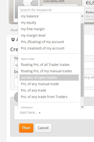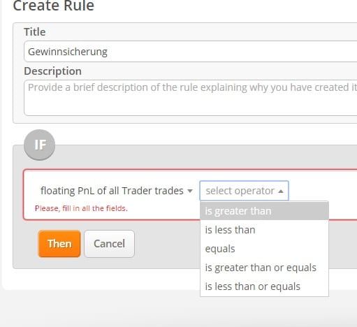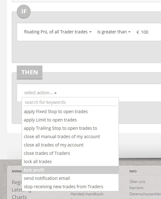 Nach einer simplen wenn – dann – Definition, kann der Anwender bestimmen, was bei einem bestimmten Kontostand, freier Margin, offener Gewinne/Verluste etc. erfolgen soll.