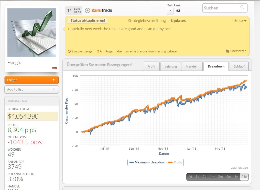 Der stetig ansteigende Performancegraph darf aber nicht darüber hinweg täuschen, dass der Händler auch einen teilweise nicht unerheblichen Drawdown in Kauf nimmt. Diese Art des Tradings ist aber eher schon Tradition auf ZuluTrade…