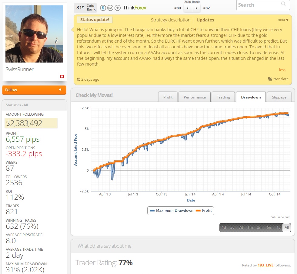 Nachdem klar war, dass die SNB zu ihrer Stabilisierung steht, konnte man sich auf ein geschmeidiges Rumdillern mit Gewinnaussichten von 10 – 50 pips für die Zukunft einstellen. Getreu dem Motto, die SNB wird es schon richten und den Franken nicht preisgeben. Dies funktioniert nun schon ein paar Monate und der besagte Trader auf ZuluTrade mit dem Nicknamen „SwissRunner“ hat seine Strategie darauf ausgerichtet.