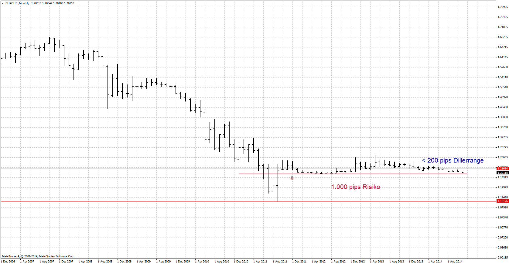 Wie dem nachfolgenden Monatsschart zu entnehmen ist, hatte die SNB den Wechselkurs des Schweizer Franken zum Euro nach einer extremen Talfahrt auf 1,20 festgezurrt. Den Geruch der verbrannten Shorties am Tag der Bekanntgabe kann man teilweise heute noch atmen…