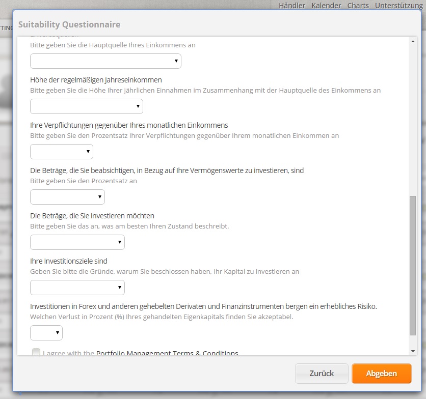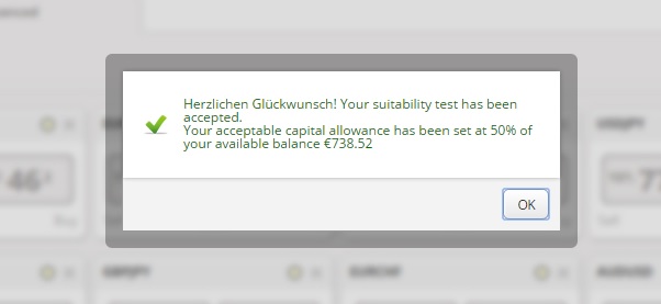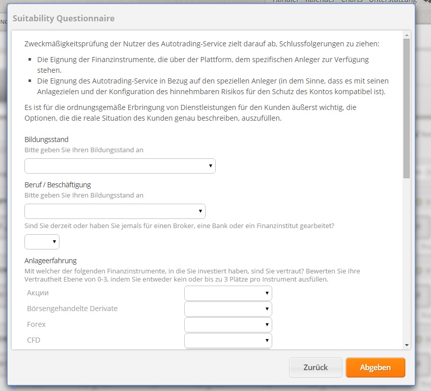 Bei der ersten Anmeldung nach dem 12. Dezember 2014 werden Sie aufgefordert, einen kurzen und einfachen Eignungs-Fragebogen bevor Sie mit ZuluTrade weitermachen, auszufüllen.