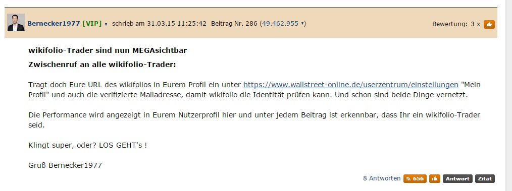 Wer als User von wallstreet-online.de ein wikifolio führt, kann dieses nun grafisch der geneigten Leserschaft zur Kenntnis bringen. Beiträge des entsprechenden Nutzers weisen ihn dann als wikifolio Trader aus. Damit hat er nicht nur die Chance, seine Reichweite zu erhöhen, sondern interessierte Investoren können natürlich auch Fragen und Meinungen zu seinen wikifolios äußern.