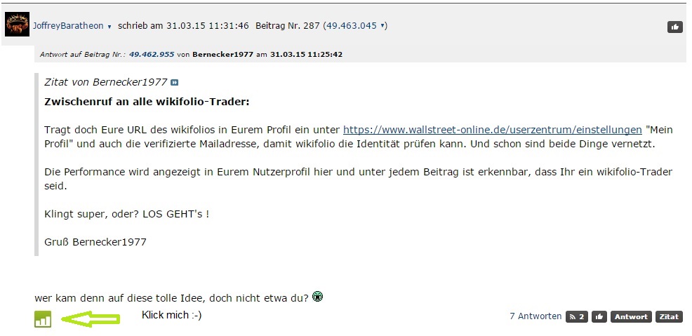 Das süße kleine wikifolio Logo ist nun in jedem Beitrag sichtbar, vorausgesetzt, man vervollständigt seine Profilseite bei wallstreet-online.de. Im Screen landet man bei Klick auf das wikifolio Logo auf die Profilseite des Users JoffreyBaratheon, alias plustick, alias Dirk Hagemann.